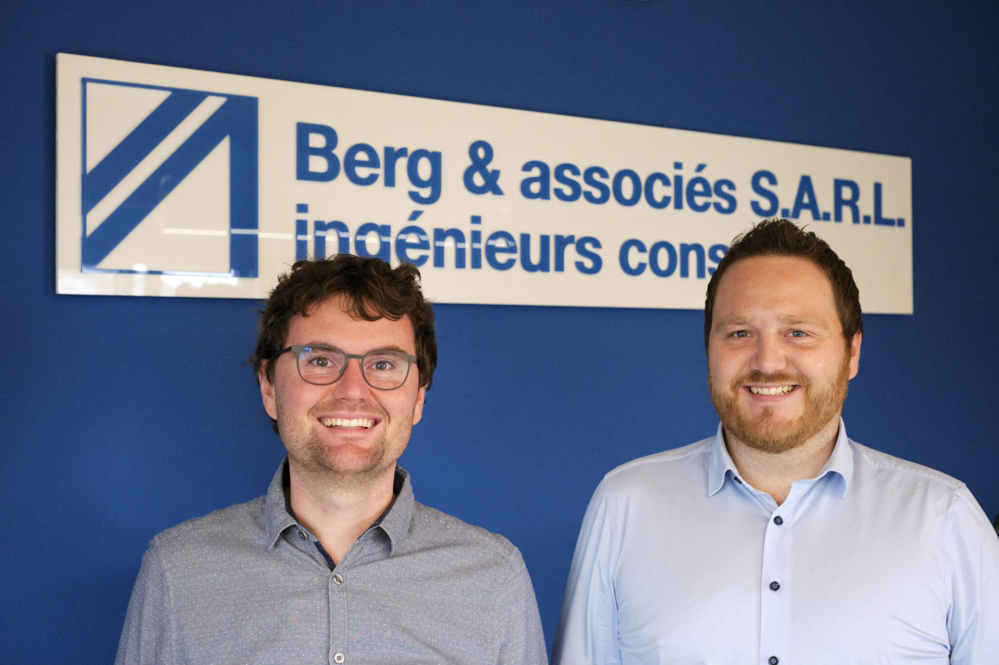 Die neuen Gesellschafter des Ingenieurbüros Berg & associés S.A.R.L., Oliver Lenz (li) und Steven Bormes (re) vor dem Bürologo in den neuen Büroräumen
