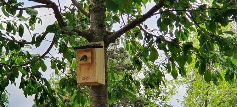 Blaumeise klettert in Nistkasten zum Füttern der Jungen